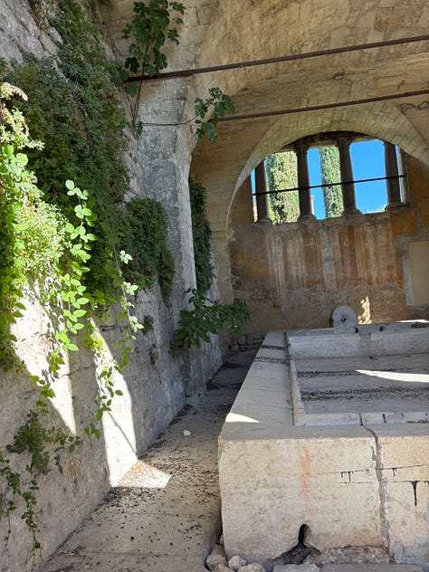 Being here has gotten me to thinking a lot about living in ruins and living ruins. Uzés is particularly well known because it’s where one of the best preserved Roman aqueducts starts. Walking down a valley from the medieval center, you reach a stream and the fontaine d’Eure, originally venerated by the Celts as a sacred spring. The water from it was then channeled over 50 kilometers to the Roman city that later became Nîmes.